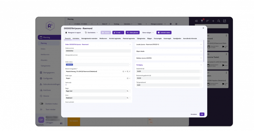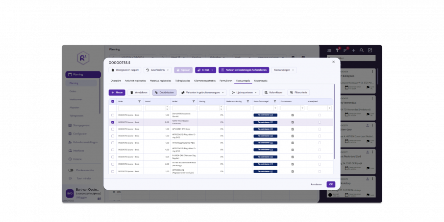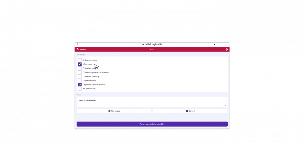 In de mobiele app houdt de buitendienst bij welk werk ze verrichten, welke onderdelen ze gebruiken en wat de status van het project is.